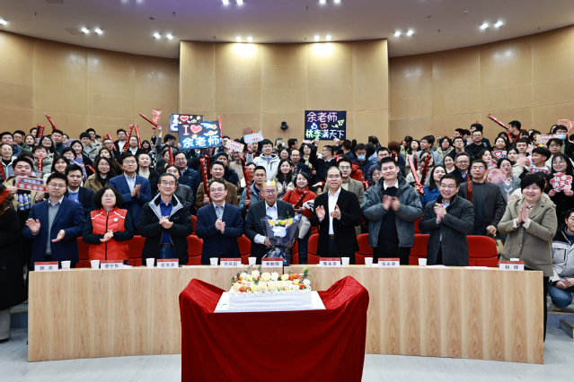 随后,活动还举行了余伯阳教授生日庆祝仪式。伴随着欢快的音乐和热烈的掌声,现场师生为余老师送上生日的美好祝福,并合影留念。