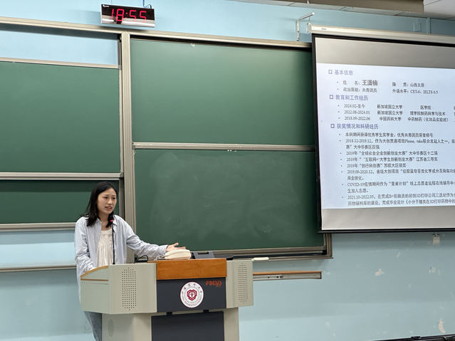 随后,2020级中药学专业李冠达同学从他申请澳大利亚莫纳什大学的升学去向、留学国情分析、留学优劣势、留学考量因素等方面展开详细分享,鼓励同学们早做规划,为未来的留学之路做好充分准备。2018级中药制药专业王潇楠校友以成功申请新加坡国立大学的亲身经历,向学生们讲述了一个从大学创新项目走向留学之路的励志故事。她以大学时期的“环保吸管”项目为起点,逐步深入到各类创新和实践项目中,她也同样鼓励同学们在本科期间积极参与创新实践项目和科研项目,提升创新意识,丰富实践经历。