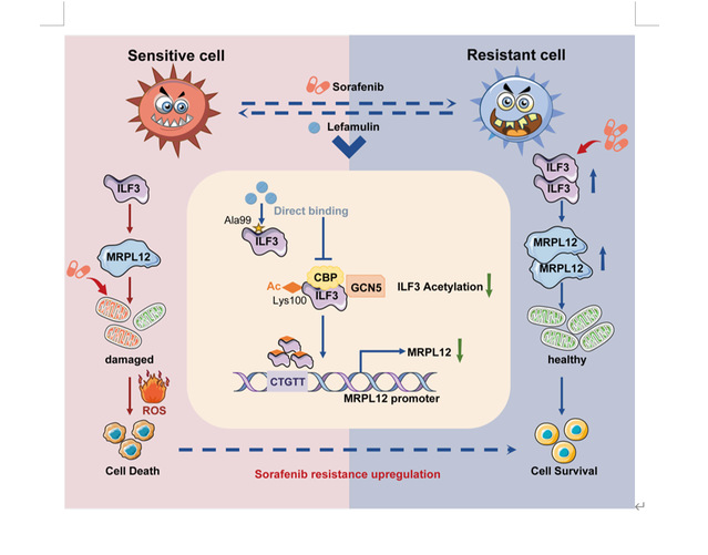 该团队基于逆转肝癌耐药的表型筛选模型,从1430个临床批准的小分子药物中筛选得到一种新型逆转肝癌耐药的天然产物衍生物—截短侧耳素抗生素来法莫林(Lefamulin)。该研究发现,Lefamulin可在肝癌细胞系、异种移植瘤模型和水动力诱导的肝癌模型中克服酪氨酸激酶抑制剂(TKIs,包括Sorafenib、Regorafenib、Lenvatinib)耐药。进一步研究发现,Lefamulin通过靶向结合ILF3蛋白Ala99位,阻断GCN5/CBP介导的ILF3 Lys100位乙酰化,进而抑制ILF3介导的MRPL12转录,调控线粒体稳态、逆转肝癌耐药。该研究首次揭示了ILF3作为临床肝癌耐药生物标志物的重要作用,并为以ILF3为靶标的创新药物研发及联合治疗策略奠定了基础。