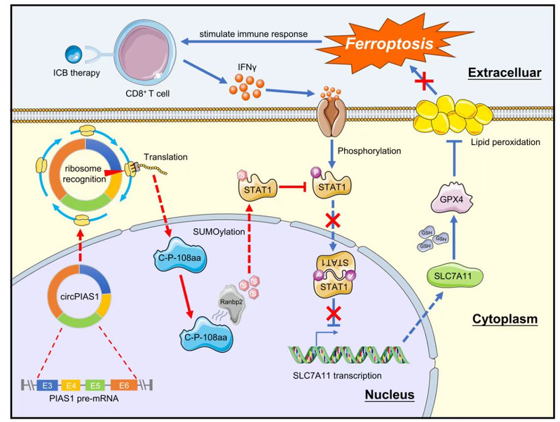 该团队聚焦环状RNA在癌症进展中的作用,特别是发现了一种由核定位的circPIAS1编码的长108aa的特殊多肽(circPIAS1-108aa)。研究表明,黑色素瘤细胞中的circPIAS1-108aa通过招募SUMO E3连接酶Ranbp2促进STAT1的SUMO化(K703,E705),进而抑制了STAT1的磷酸化(Y701),最终帮助癌细胞逃脱由IFNγ诱导的免疫性铁死亡的影响。此外,特异性靶向circPIAS1的ASOs(反义寡核苷酸)与PD-1抑制剂联合用药可显著抑制黑色素瘤的生长,大大提高了ICB疗效。该研究重点发现了circPIAS1-108aa是限制恶性黑色素瘤免疫药物治疗的关键因素,也为改善ICB疗法提出了一种前景广阔的策略。