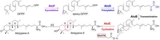 杂萜类天然产物是由萜类与非萜类生物合成途径结合而成的独特分子,广泛存在于植物、真菌和细菌中,因其结构多样性和显著生物活性,在药物开发中具有重要价值。然而,细菌来源的杂萜相对稀少,且其生物合成机制尚未充分解析,尤其是全氢菲类杂萜化合物的合成路径仍不明确,制约了这类分子的进一步开发。在本项研究中,课题组通过合成生物学、酶学及生物信息学等多学科交叉手段,揭示了细Atolypenes 碳环骨架的三步合成新路径:环氧化、异戊烯基化和环化。这一途径显著区别于已知的真菌杂萜合成方式,扩展了细菌杂萜生物合成策略。同时,通过体外实验深入解析了非典型 II 型萜烯合酶AtoE的催化机制,首次明确了关键位点 E314 在萜类环化中的作用。此外,通过生物信息学分析,发现类似非典型萜烯合酶在细菌基因组中普遍存在,提示细菌中或蕴藏着更多未被发现的杂萜类天然产物。