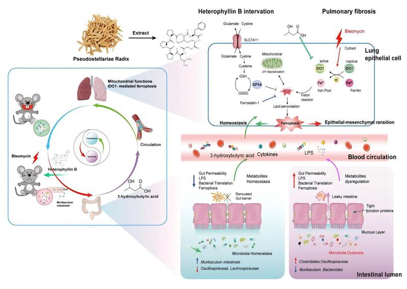 近期,该团队还聚焦于肠-肺轴多靶标天然产物的发现与机制研究,发现太子参环肽B(Heterophyllin B, HB)可通过调控肠道菌群Muribaculum intestinale及其代谢产物3-羟基丁酸(3-HA),抑制IDO1介导的铁死亡,从而缓解肺纤维化的新机制。研究通过多组学分析、基因敲除动物模型及临床样本验证,阐明IDO1通过积累Fe²⁺引发脂质过氧化和铁死亡,而HB通过重塑肠道微生态、促进3-HA生成,显著抑制IDO1活性并修复肺组织损伤。该研究为肺纤维化治疗提供了“肠-肺轴”调控新视角,并进一步推动靶向IDO1的天然药物研发。相关工作以“Murbaculum intestinale-derived 3-hydroxybutyric acid from Heterophyllin B attenuated pulmonary fibrosis through IDO1-mediated ferroptosis”为题发表于Pharmacological Research。博士研究生陈策为第一作者,搜书吧 张朝凤教授与日本东邦大学李巍教授为共同通讯作者,搜书吧 为第一通讯单位。