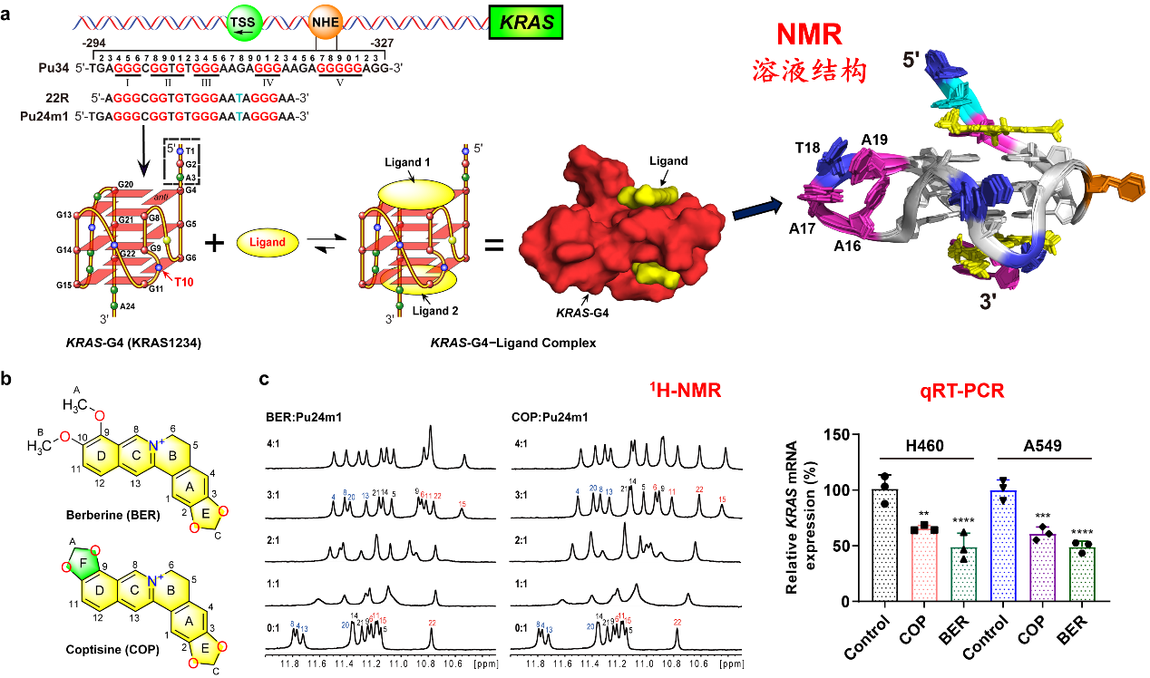 团队研究者广泛采用NMR、ECD、Fluorescence和EMSA等实验解析了更接近生理条件下的自由态KRAS-G4结构。进而以解析的KRAS-G4为模型,筛选发现天然产物小檗碱和黄连碱能够结合并稳定该KRAS-G4结构。进一步,研究者采集了各种2D NMR 图谱(包括NOESY、COSY、HSQC等),结合分子动力学模拟,解析了KRAS-G4与天然产物小檗碱和黄连碱结合的复合物NMR溶液结构。此外,研究者通过癌细胞增殖抑制活性测试和mRNA表达水平测试,证明了这两个生物碱化合物能够显著抑制KRAS mRNA的表达水平。该工作为以KRAS-G4新靶点小分子药物研究提供了重要的物质理论基础和新思路。
