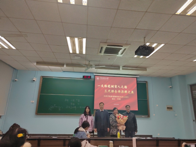 罗俊教授表示,三十多年来,蒋老师扎根讲台,在自己热爱的岗位上教书育人、兢兢业业,对她为天然药物化学系教学和人才培养付出的努力和心血表示敬意。学生代表为蒋老师献花。蒋建勤老师深情回顾了自己的从教经历,对学校、学院在科研、教学工作方面一直以来给予的支持表示衷心感谢,并表达了对学校、学院未来越办越好的美好祝愿,她还勉励同学们要珍惜校园时光、精进药学知识。