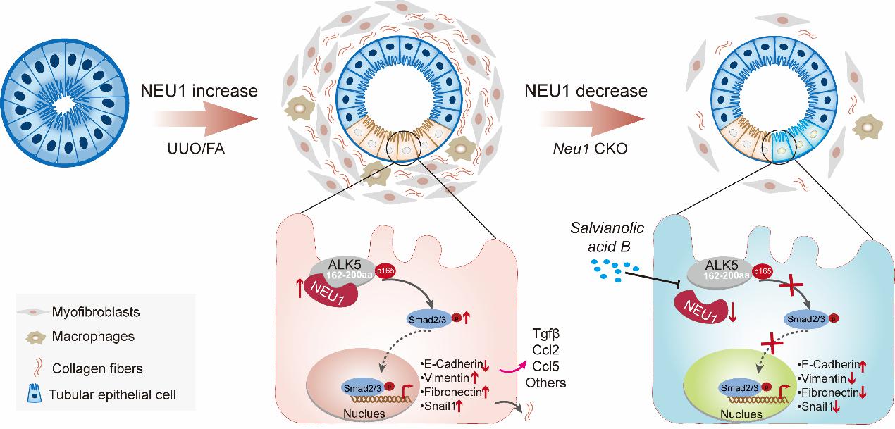 研究人员进一步以人源NEU1为靶点,从中药中筛选具有肾脏保护作用的活性成分。从近百个中药单体化合物中发现中药丹参中的丹酚酸B与人源NEU1重组蛋白具有极强亲和力(KD = 21.57 nM),是其他酚酸类成分如丹酚酸A结合能力的1000;通过动物水平研究,明确了丹酚酸B抑制NEU1、对抗ALK5-Smad2/3通路激活改善肾纤维化;利用NEU1敲除小鼠,证实丹酚酸B依赖于NEU1对抗肾损伤,为揭示丹参发挥肾保护作用的科学内涵提供直接靶点证据(图)。