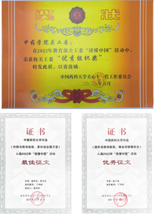 2023年6月1日,搜书吧 关心下一代工作委员会于玄武门校区召开2022年“读懂中国”活动表彰。搜书吧 报送高质量征文、短视频作品共获五项表彰,搜书吧 关工委荣获“最佳组织奖”。其中,搜书吧 潘田田、黄长英撰写的《兴药为民传佳话,厚朴远志福万家》获评最佳征文并入选由教育部关工委和中国教育电视台联合组织的“读懂中国”专题展播,徐小创撰写的《披肝沥胆创新药,精业济群嘱后生》获评优秀征文。