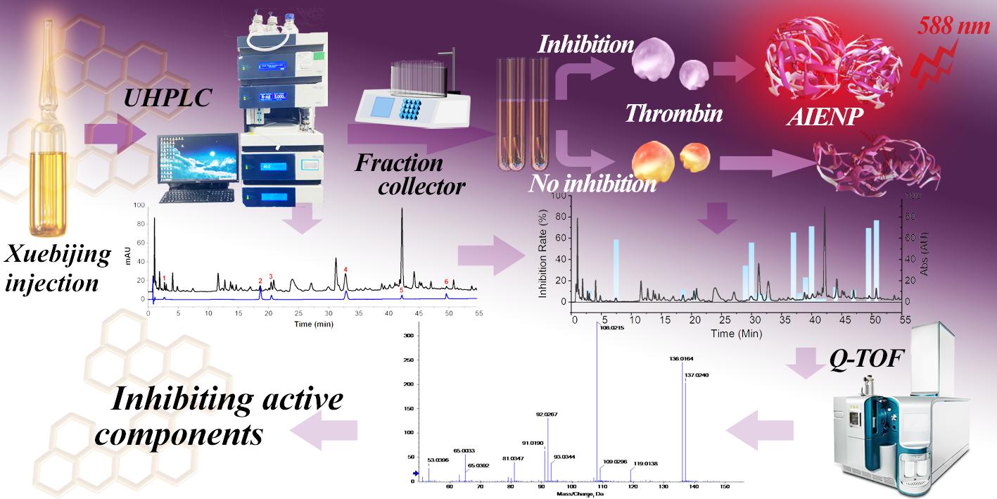 中药复方是中医在临床应用中的主要形式,中药复方的药效物质辨识一直是研究难点。团队开发了一种基于聚集诱导发射(AIE)的荧光探针(图2),用于监测凝血酶活性。该探针进一步与超高效液相色谱-馏分收集器(UHPLC-FC)和超高效液相色谱四极杆飞行时间质谱(UHPLC-Q-TOF/MS)相结合,建立谱效导向策略对血必净注射液中凝血酶抑制剂进行分离、制备、筛选和鉴定。最终成功获得6个具有较高抗凝血活性的化合物(没食子酸、绿原酸、氧化芍药苷、咖啡酸、洋川芎内酯I和丹酚酸B),总体抑制率约为血必净注射液抑制率的60%。这一成果为中药复方的药效物质辨识提供了新技术和方法。相关研究以“An Aggregation-Induced Emission Sensor Combined with UHPLC-Q-TOF/MS for Fast Identification of Anticoagulant Active Ingredients from Traditional Chinese Medicine”为题发表在Analytica Chimica Acta上(全文链接://doi.org/10.1016/j.aca.2023.341799)。搜书吧 硕士研究生李子怡为论文第一作者,搜书吧 为第一通讯单位。