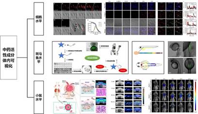 实现对中药活性成分在体可视化监测与作用机制发现。一方面可以利用荧光探针动态监测细胞、活体损伤情况,评价药物浓度和剂量对其的影响。另一方面将活性成分进行结构改造,修饰荧光基团,确定其靶器官和靶蛋白。利用该技术体系已经完成黄葵胶囊、血必净注射液、黄芪等中药活性成分体内可视化研究。