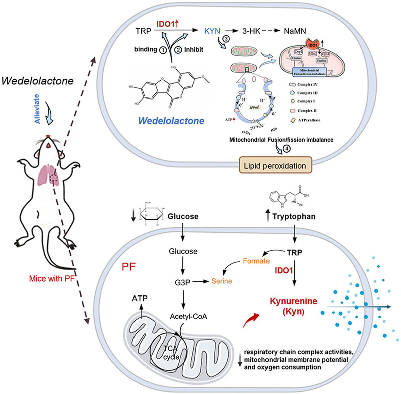 肺纤维化是一种高致死性呼吸系统疾病,临床治疗药物有限且副作用显著。团队前期发现IDO1在肺纤维化患者及动物模型中显著上调,并与胶原蛋白等纤维化标志物呈正相关。通过空间代谢组学、转录组学发现IDO1敲除小鼠可显著抑制肺成纤维细胞的增殖、分化、线粒体生物发生以及氧化磷酸化功能,从而减轻肺纤维化病理损伤。通过对小分子药物库的高通量筛选和结合验证发现,天然产物蟛蜞菊内酯(Wedelolactone, WEL)通过共价结合IDO1的K242位点,逆转线粒体功能障碍和脂代谢紊乱,显著改善小鼠肺纤维化病理表型,相同剂量下疗效与优于临床药物尼达尼布。该研究首次提出IDO1作为肺纤维化线粒体代谢调控枢纽,为靶向IDO1的药物开发提供全新策略。相关工作以“The crucial function of IDO1 in pulmonary fibrosis: From the perspective of mitochondrial fusion in lung fibroblasts and targeted molecular inhibition”为题发表于Acta Pharmaceutica Sinica B。博士研究生王磊为第一作者,搜书吧 张朝凤教授与南京鼓楼医院张楼乾主任为共同通讯作者,搜书吧 为第一通讯单位。