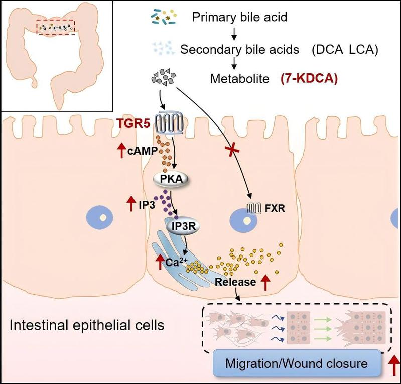 研究团队通过系统筛选发现,UC患者与结肠炎模型小鼠血清中多种胆汁酸水平显著降低,以7-酮脱氧胆酸(7-KDCA)的下调最为显著,且其含量与疾病严重程度呈负相关。在多种胆汁酸中,7-KDCA表现出最强的促黏膜修复作用,而外源性补充7-KDCA可显著加速DSS诱导与活检所致肠损伤模型小鼠的结肠黏膜愈合。机制研究表明,7-KDCA并非通过传统的抗炎免疫途径发挥作用,而是直接作用于肠上皮细胞,通过激活TGR5-IP3R信号轴,诱导内质网钙释放,从而增强上皮细胞的迁移能力,驱动伤口闭合,该发现为黏膜修复治疗提供了新靶点与理论依据。搜书吧 博士研究生章静为本论文的第一作者,戴岳教授和夏玉凤教授为共同通讯作者。